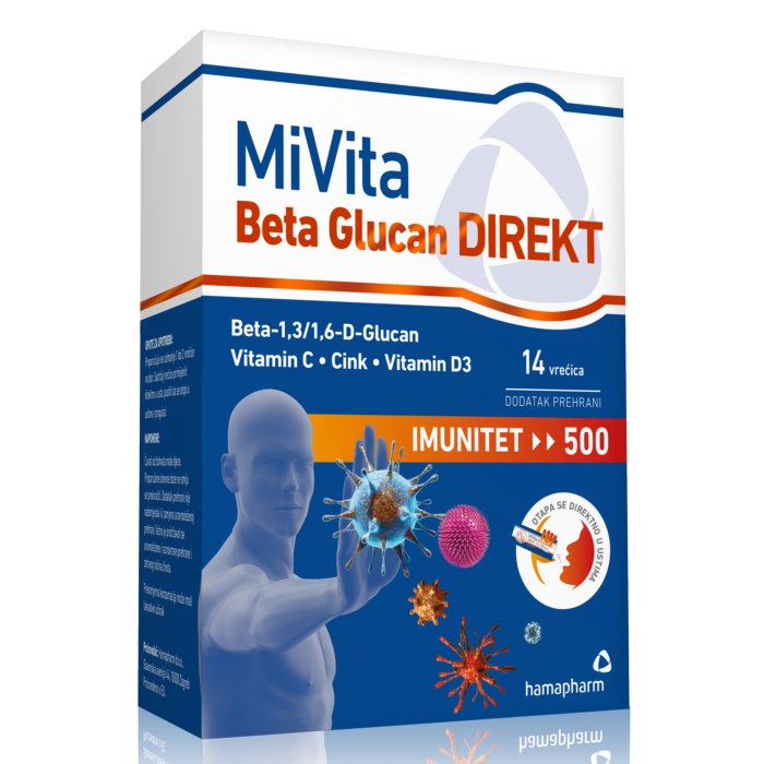 MiVita Beta Glucan direkt je dodatak prehrani namijenjen jačanju imuniteta, a sadrži beta glukan, vitamin C, vitamin D i cink.
