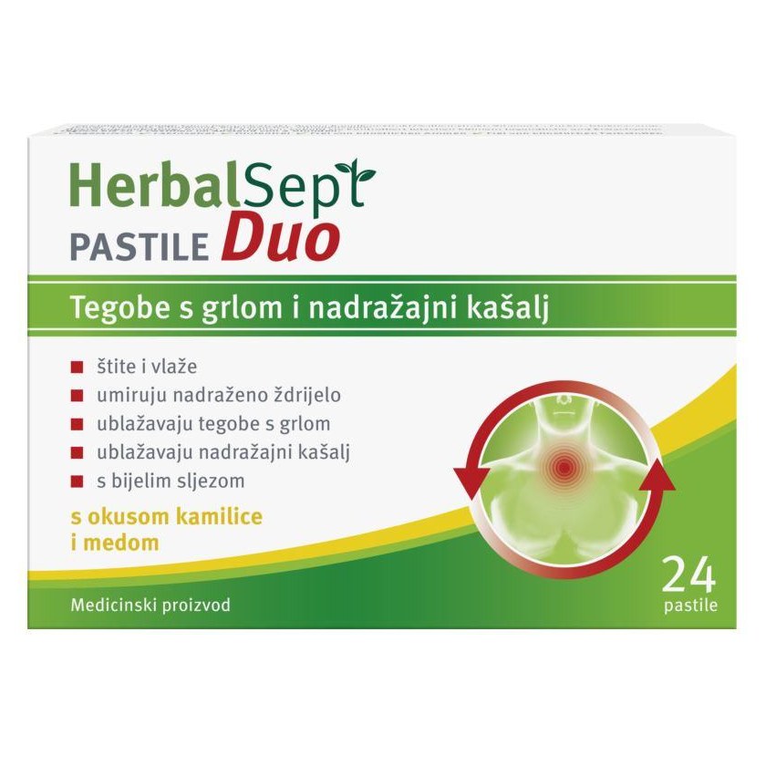 Upute za primjenu: Prilikom otapanja u ustima postupno se oslobađaju djelatne tvari Herbal Sept Duo pastila i kao balzam oblažu nadraženu sluznicu grla, usta i ždrijela, tako da ju štite od daljnjih napada. Zahvaljujući zaštitnom djelovanju pastila, nadražena sluznica se bolje i brže oporavlja. Radi boljeg stvaranja mehaničkog zaštitnog filma pastile treba polako otopiti u ustima. Kako bi zaštitni film mogao djelovati, za vrijeme uzimanja pastila po mogućnosti nemojte ništa piti ni jesti.