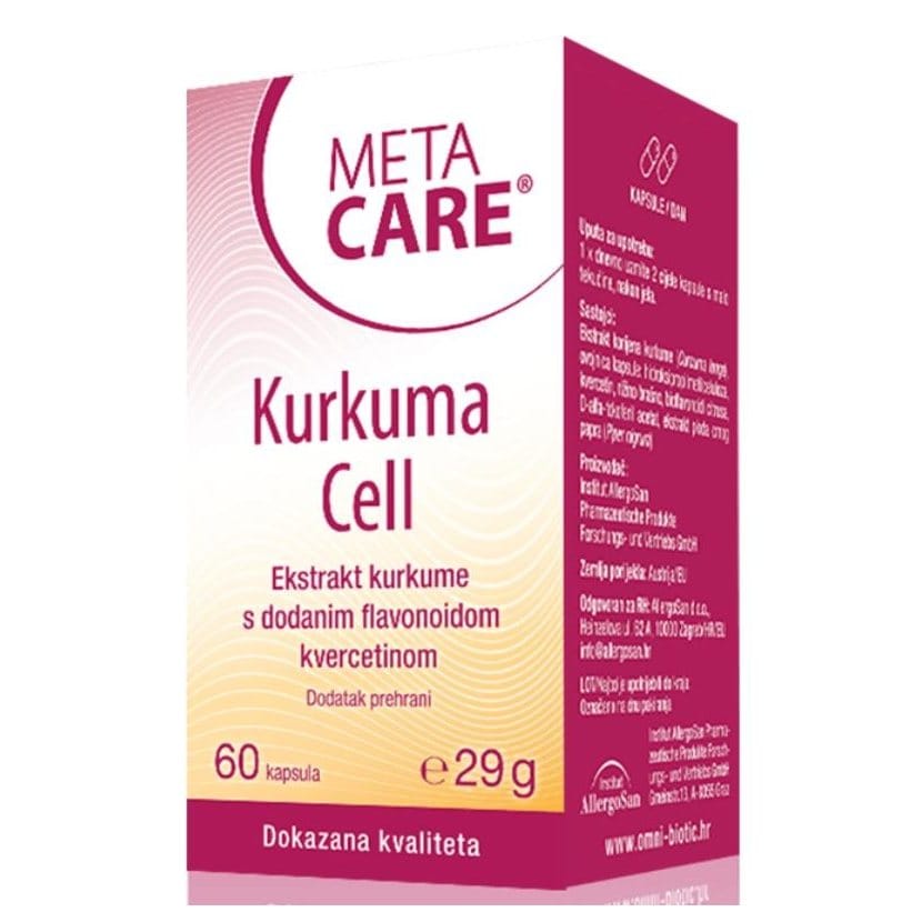META-CARE Kurkuma Cell sadrži klinički ispitani ekstrakt kurkume koji je standardiziran na visoki udio od 95% kurkuminoida. Posebno dodan ekstrakt crnog papra povećava bioraspoloživost kurkumina u tijelu. Formula je dopunjena kvercetinom, citrusnim bioflavonoidima i vitaminom E. Vitamin E je važna antioksidativna komponenta u zaštiti stanica od slobodnih radikala (doprinosi zaštiti stanica od oksidativnog stresa).