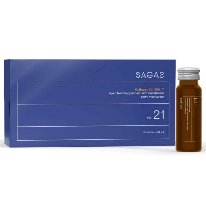 Sagas Rc 21 Collagen CitriSlim jedinstveni je tekući dodatak prehrani s formuliranim sastojcima za podršku tijelu i očuvanju kože. Sadrži pažljivo izbalansirane sastojke koji sinergijski djeluju na postizanje željenih rezultata – 20.000 mg CitriSlim® ekstrakta nezrelog ponkan ploda (Citrus reticulata), 10.000 mg Jellice®hidroliziranog morskog kolagena i 10 mg praha niskogrmolike borovnice (Vaccinium angustifolium).