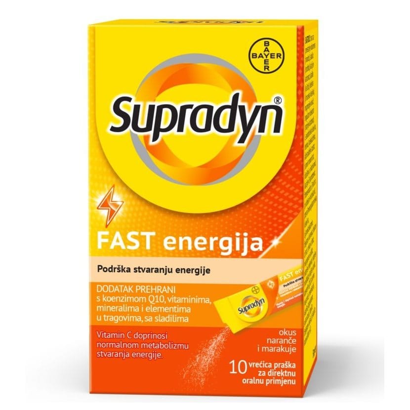 SUPRADYN FAST energija, prašak s okusom naranče i marakuje. Za odrasle i djecu stariju od 14 godina preporučujemo 1 vrećicu dnevno. Sadržaj vrećice istresite neposredno u usta, odnosno na jezik i pustite da se rastopi. Prašak možete uzeti bez obzira na obrok hrane.